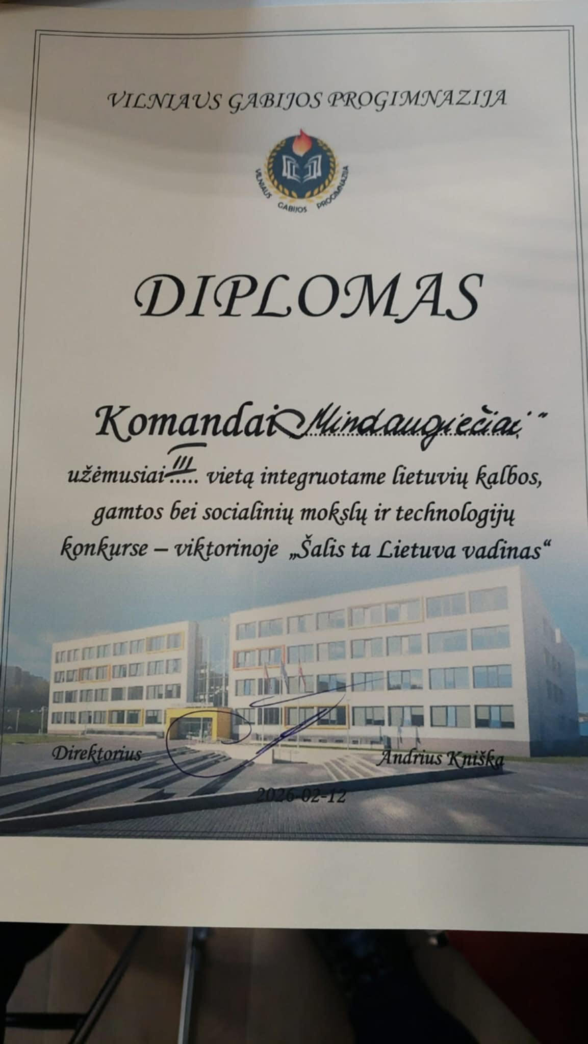 Vasario 12 dieną mūsų mokyklos mokiniai Agota, Emilija, Elena, Ignas ir Tautvilas dalyvavo Gabijos progimnazijos organizuotame konkurse–viktorinoje „Šalis ta Lietuva vadinas“.