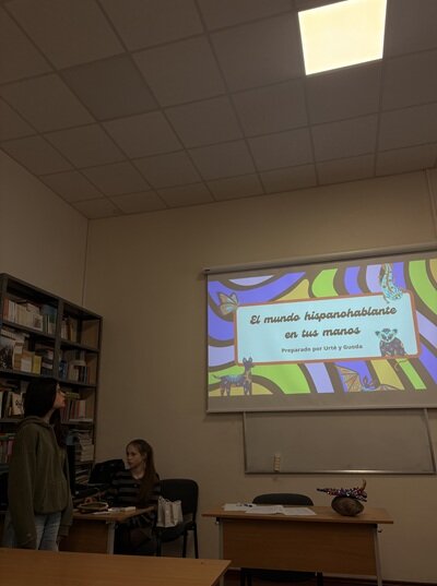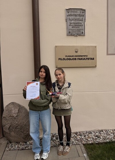Balandžio 24 d. 8b kl. mokinės Guoda Kodzytė ir Urtė Kubiliūtė dalyvavo VU filologijos fakulteto ir Ispanijos Ambasados organizuotame meniniame konkurse “El mundo hispanohablante en tus mano”, kurio tikslas buvo sukurti ispanakalbę šalį reprezentuojantį kūrinį ir pristatyti jį ispanų kalba.