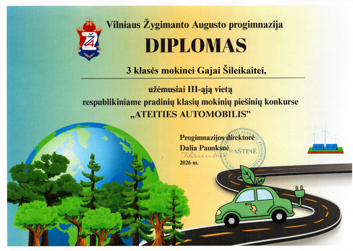 3a klasės mokinės Gaja Šileikaitė ir Agota Šalnytė dalyvavo respublikiniame pradinių klasių mokinių konkurse „Ateities automobilis“, kurį organizavo Vilniaus Žygimanto Augusto progimnazija.