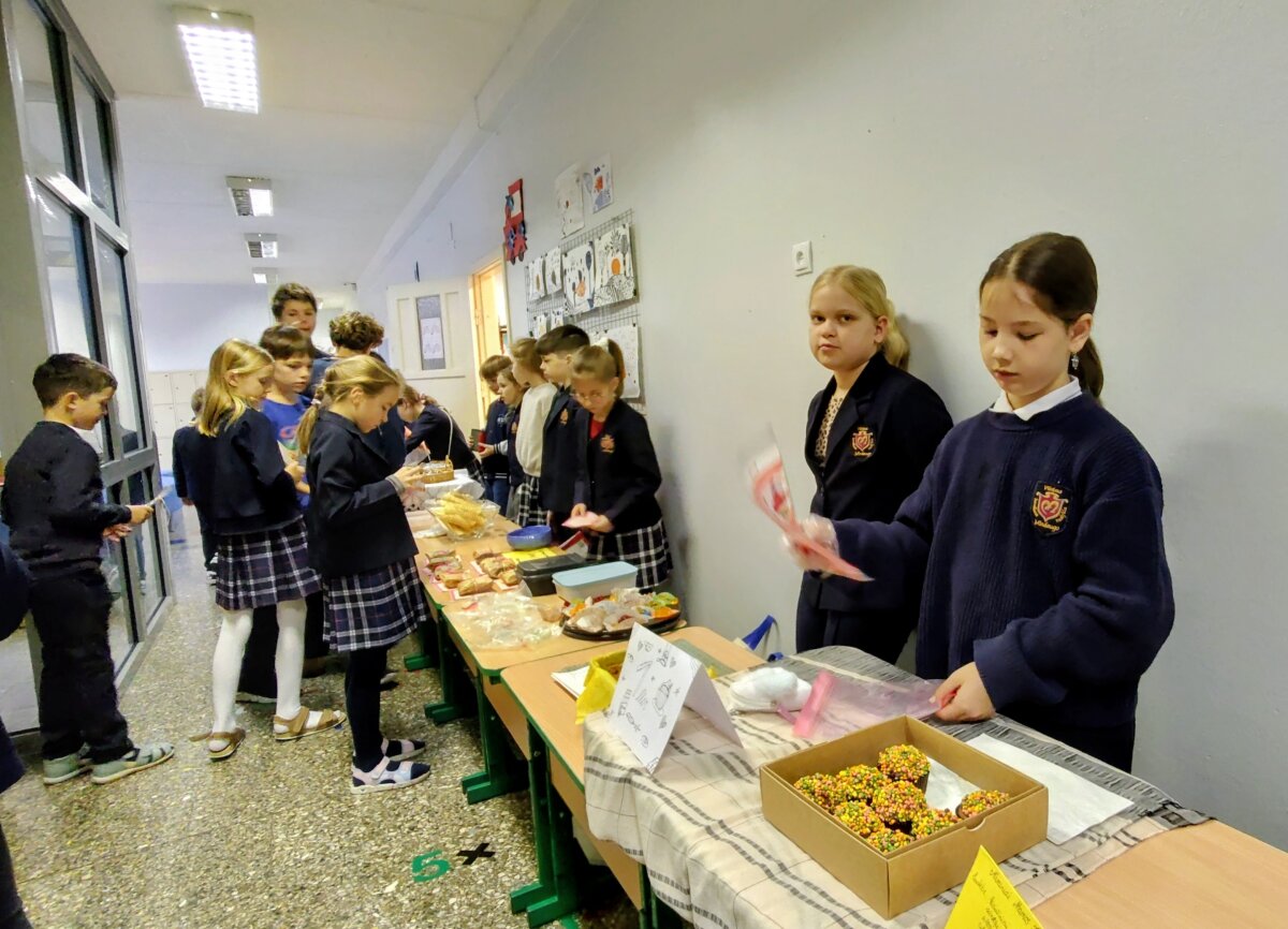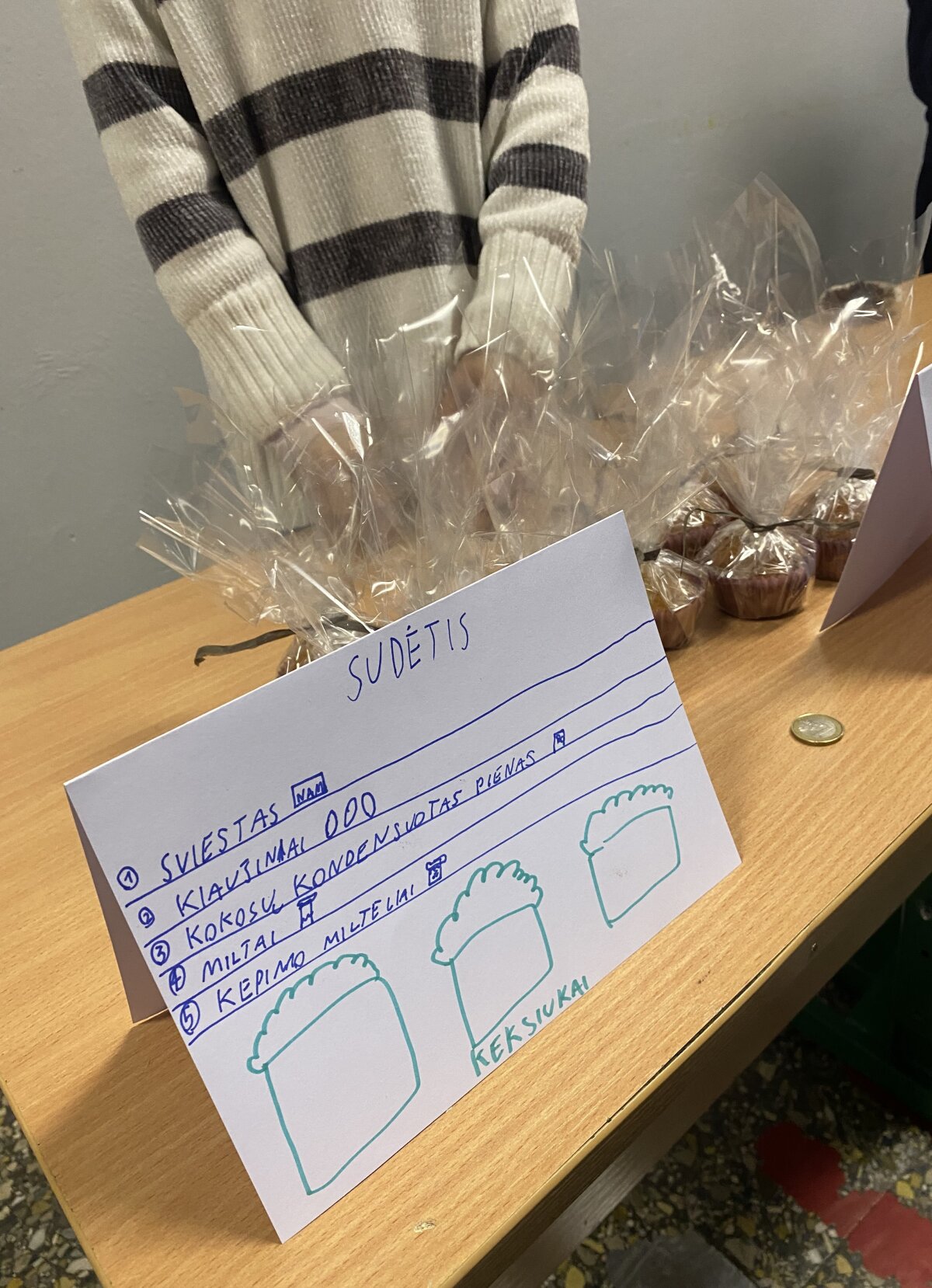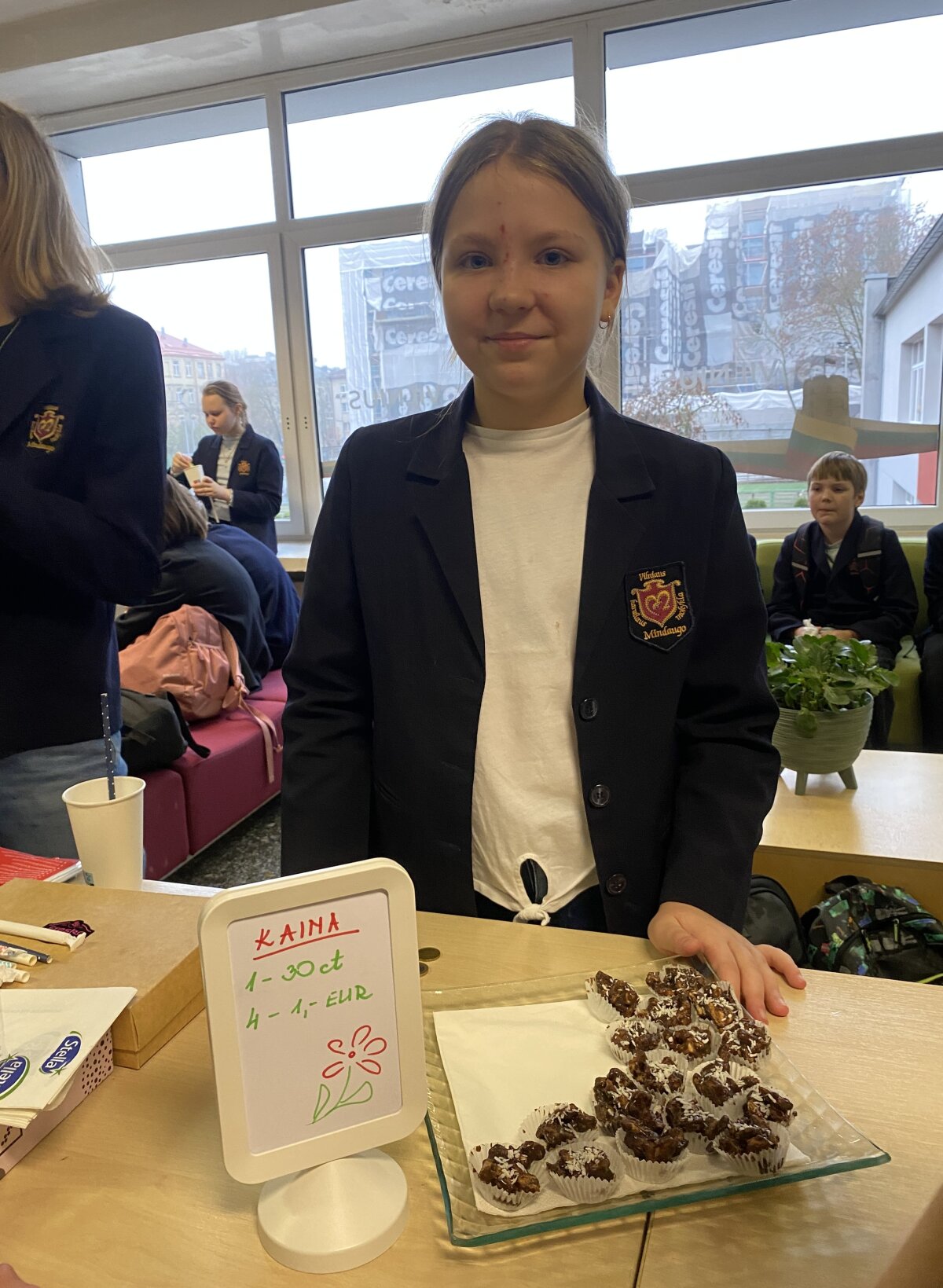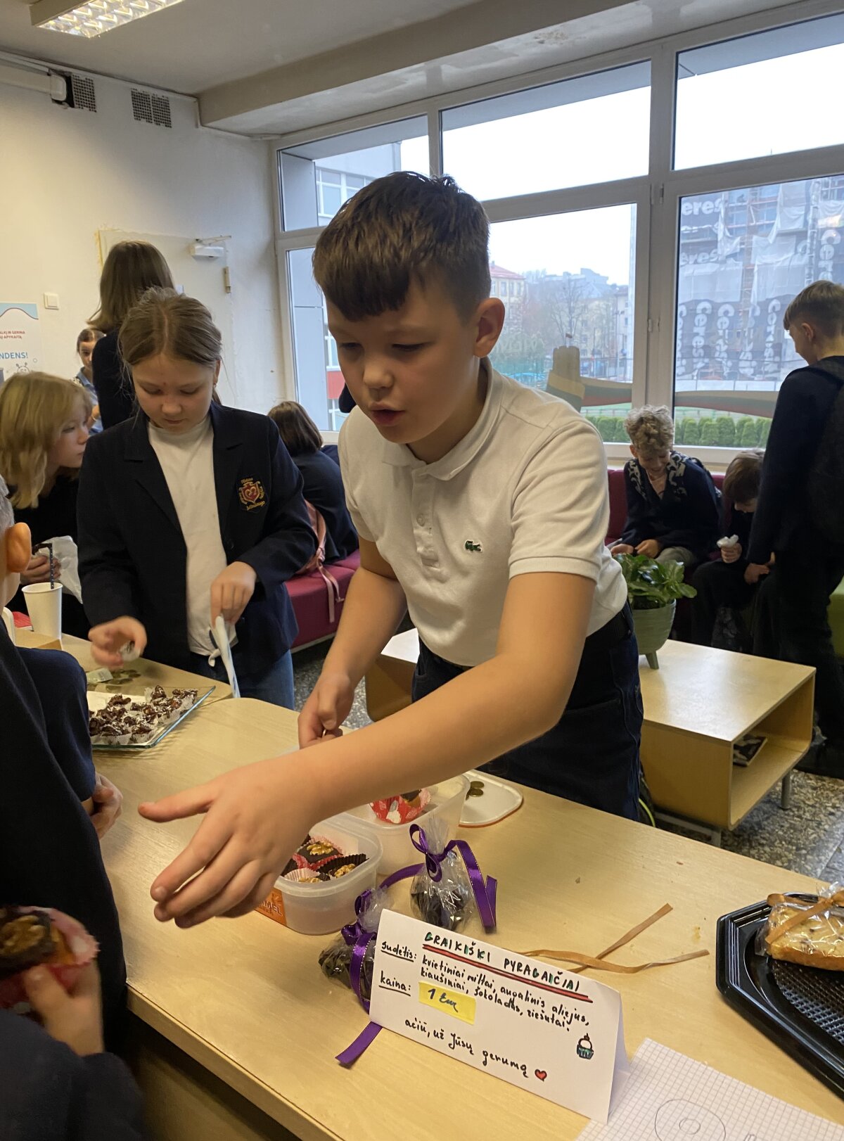 Rytą pradėjome nuo gardumynais nukrautų stalų – pradinukai kepinius pardavinėjo prie savo klasių, o 5–8 klasių mokiniai – antrojo aukšto fojė.